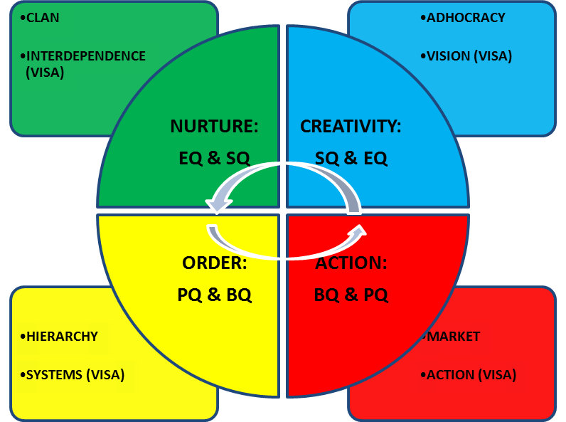 - Interdependence (VISA Model), Clan Culture (CVF), and Nurture Intelligence (Cook et al.). In this profile, the people oriented approach of the leader correlates with the people centredness of the Clan culture and the EQ and SQ of the Change Intelligences.